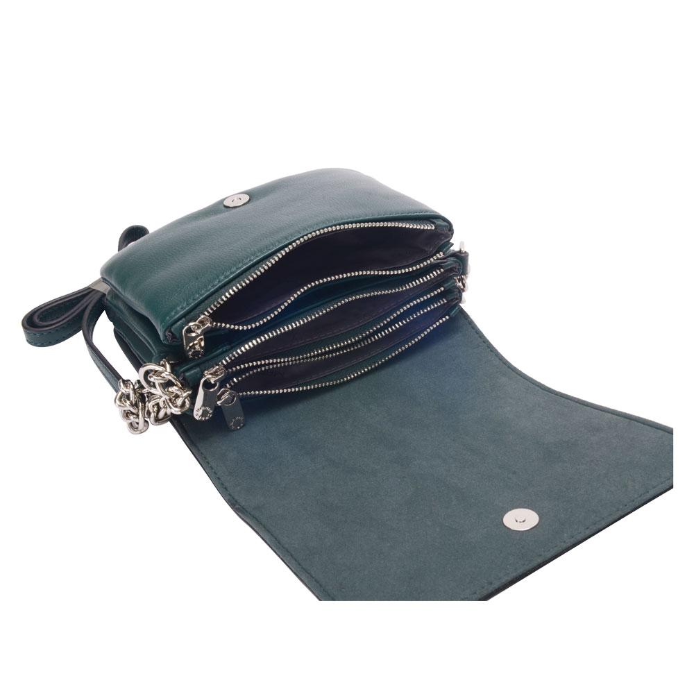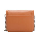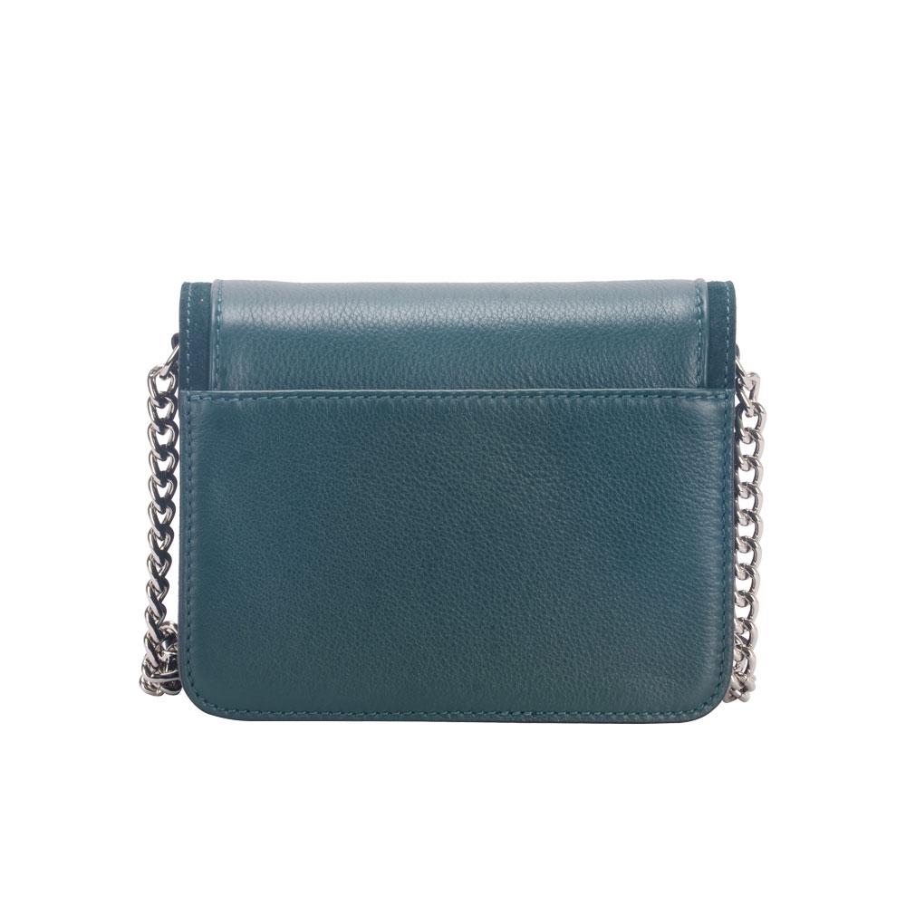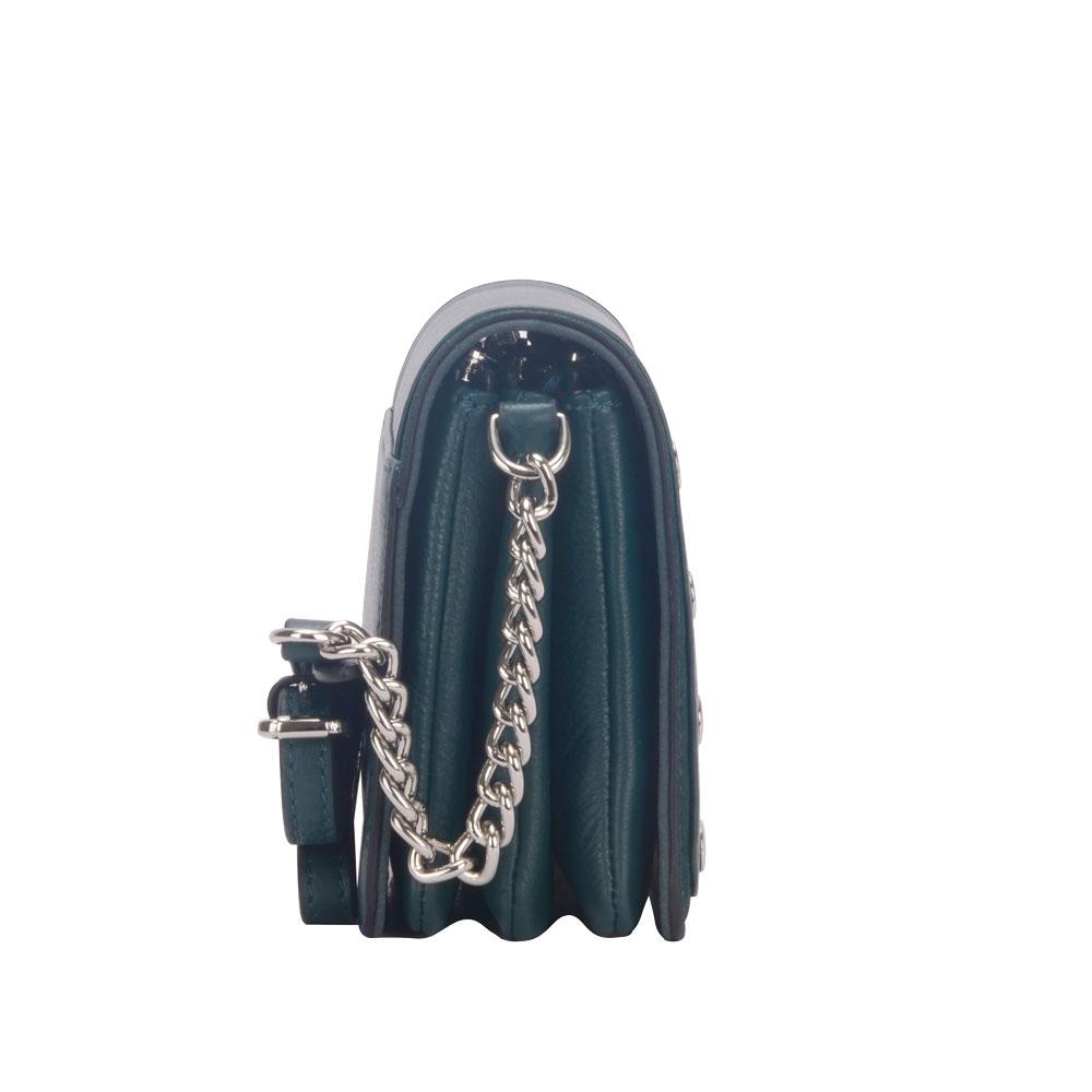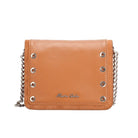 Smooth leather bag with eyelets on the sides of the front. Includes adjustable chain and leather cross body/ shoulder straps. Main compartment with magnetic flap closure. Silver metal detailing.