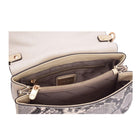 Smooth leather bag with short handle. Includes adjustable cross body/ shoulder strap. Main compartment with snake skin flap buckle. Silver metal detailing.